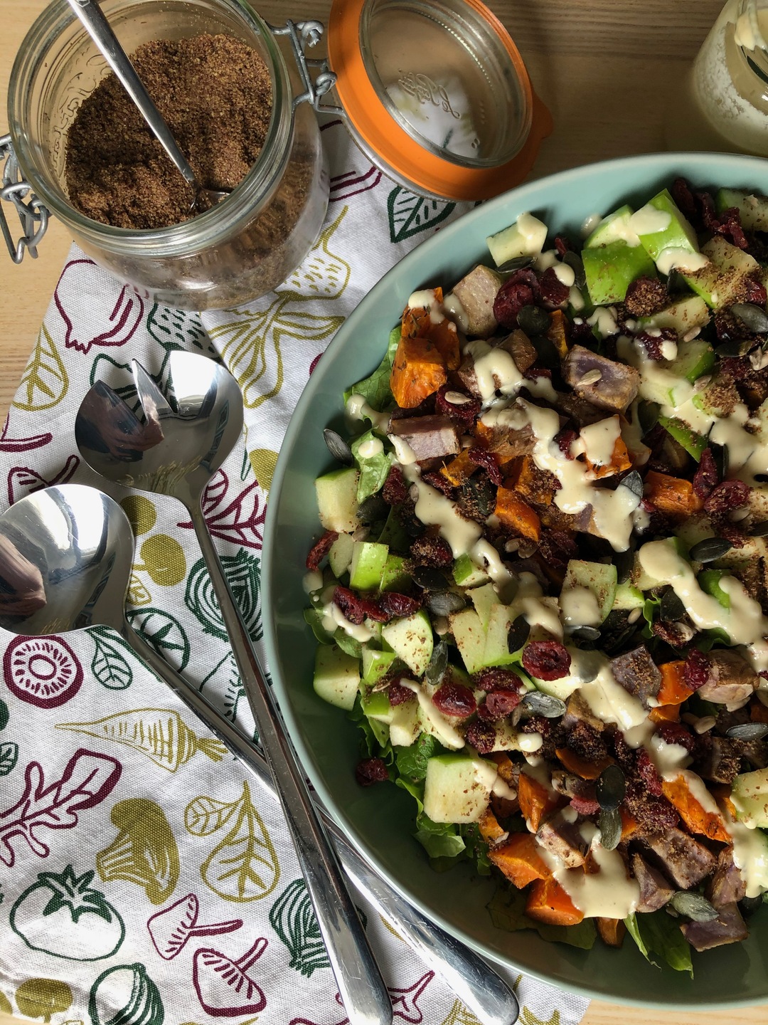 This hearty salad is a great way to eat lots of seasonal foods all together. You can even use it as a template and work with whatever you have. For instance, I used a mix of sweet potatoes and purple potatoes because that’s what I had. I also would have preferred kale but I had some lettuce we needed to use up so that’s what I went with. The creamy cashew dressing ties in the balance of sweet and savory flavors and I threw in the nuts and seeds on top for some more healthy fats and nutrients.