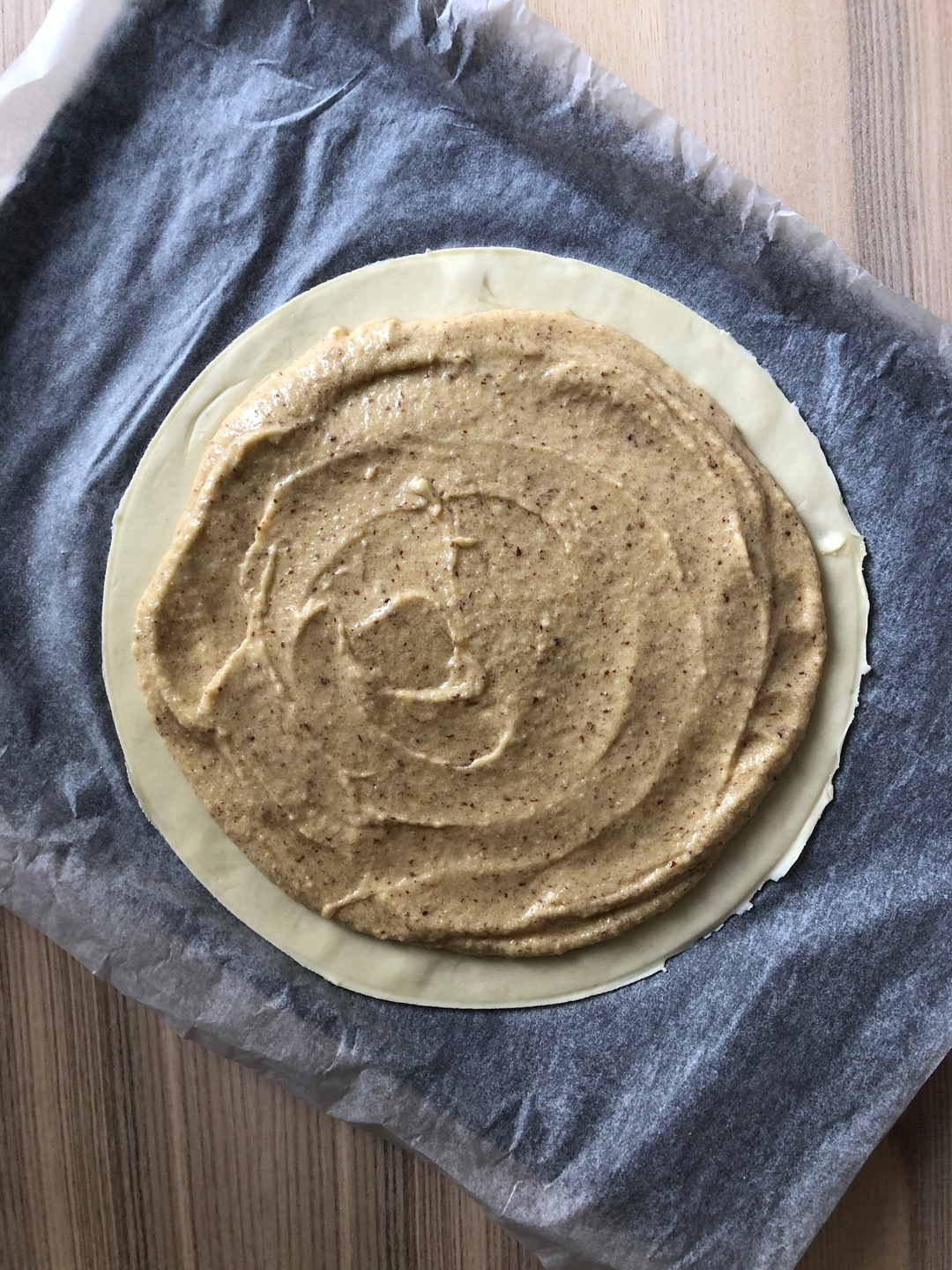 *My puff pastry was too large to fit on my baking sheet, So I cut a smaller circle out of the dough by tracing a circular pan (24 cm). In the end, I used the extra dough and some filling to make another smaller one in addition to the main one.