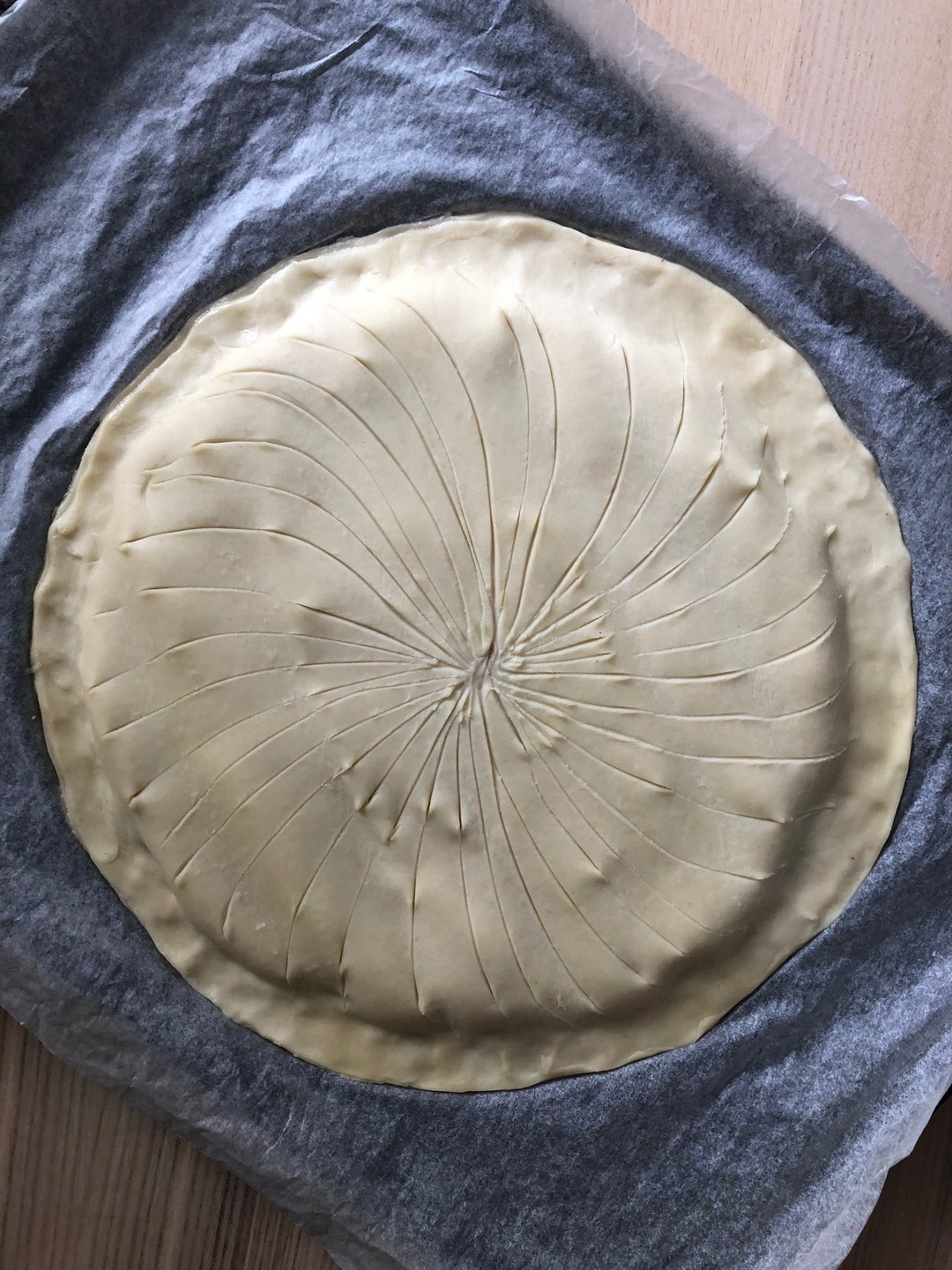 - This step is optional but quite simple : Use a knife to create a decorative pattern in the top layer of the dough by finding the center and gently running a knife from the center out to one side in a slight curve pattern. Do this over and over all around the tart, being sure to only run the knife through the surface of the dough and not cutting through to the filling.