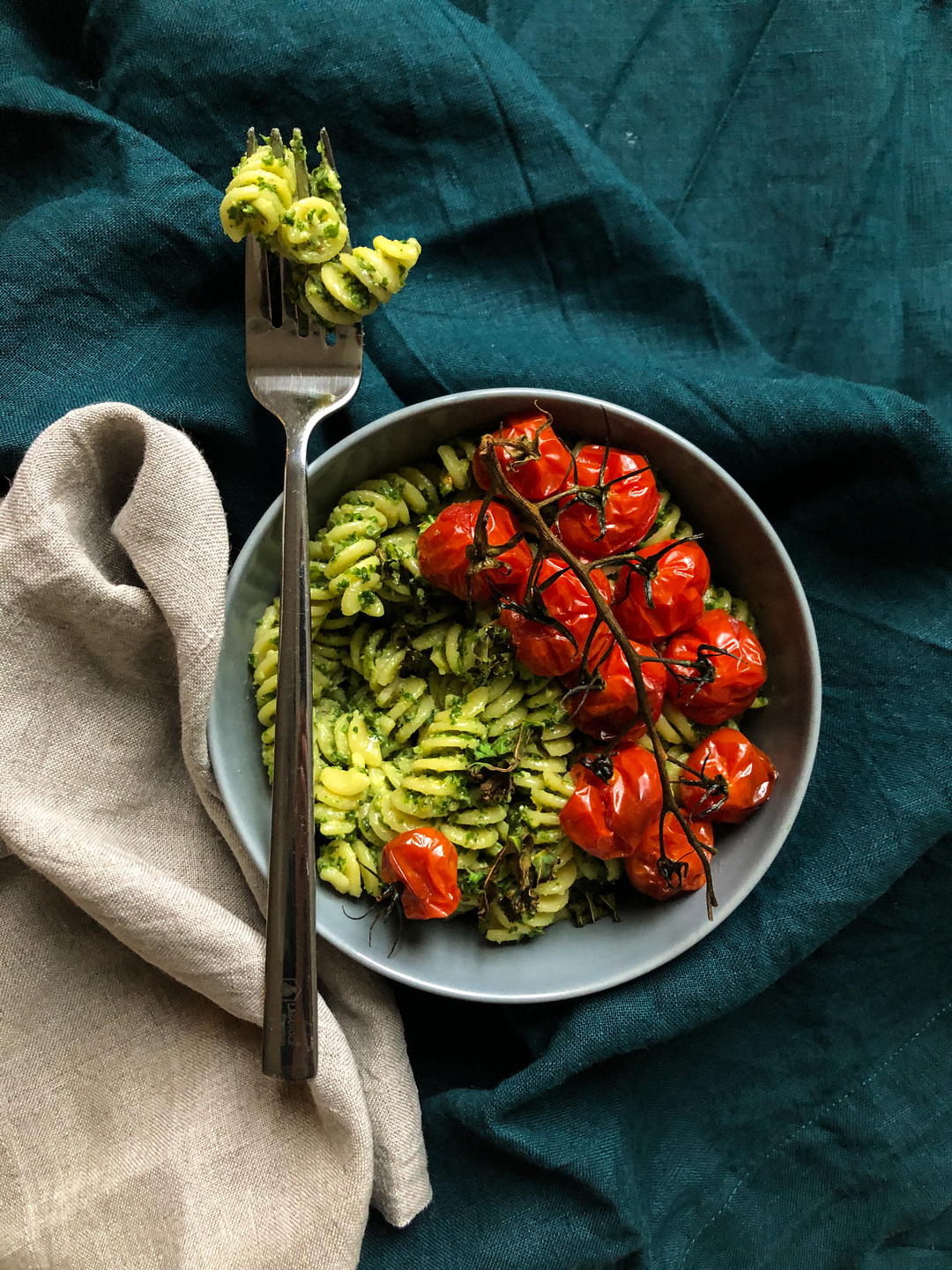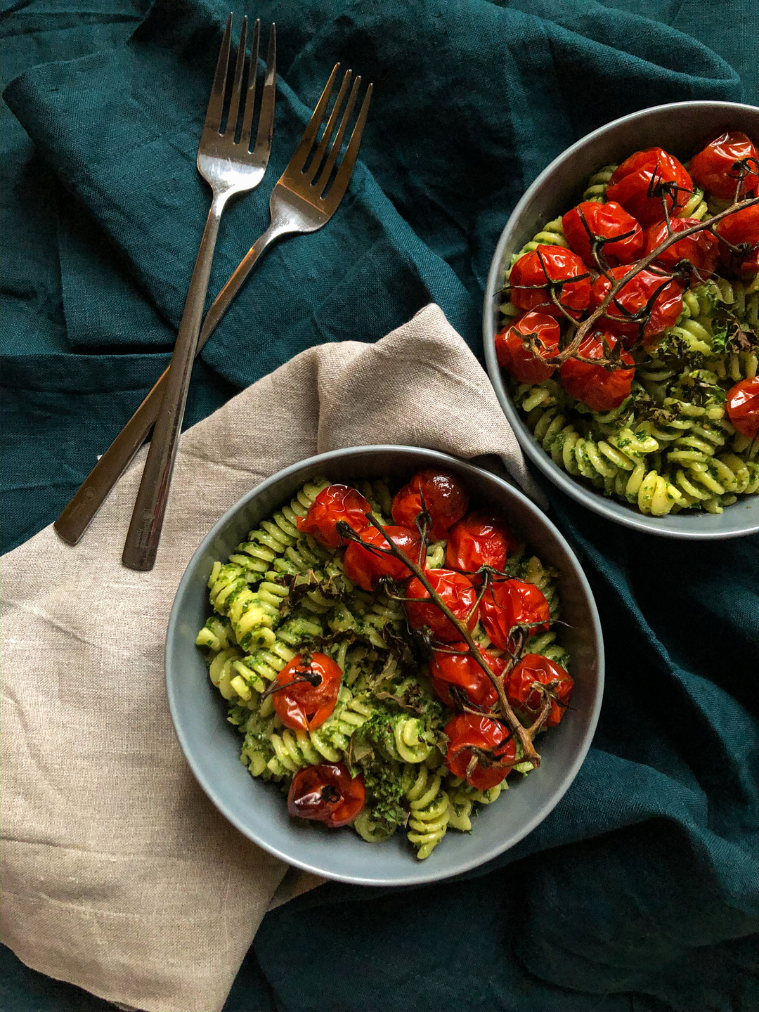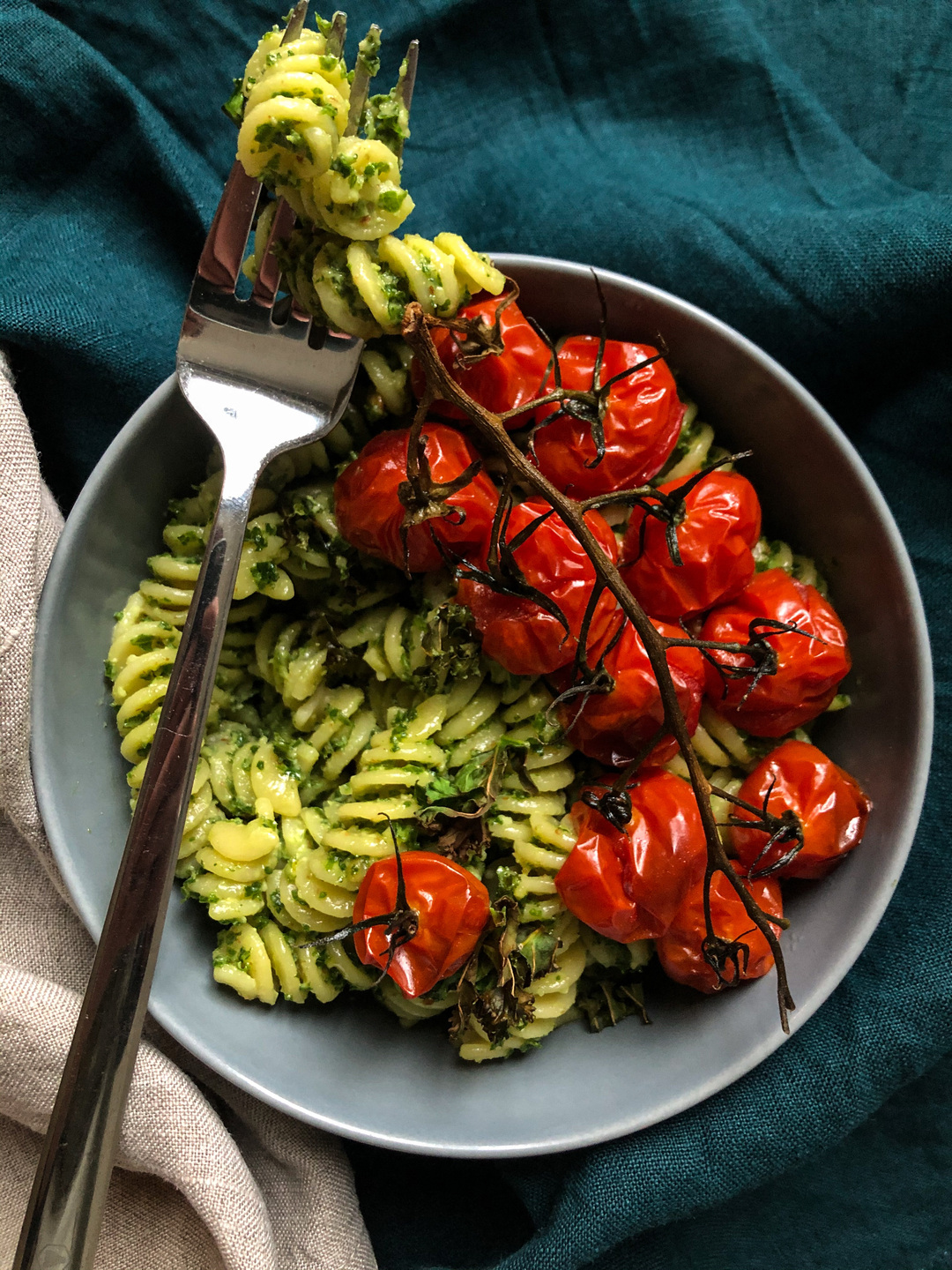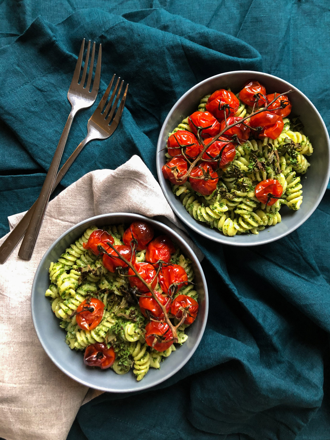 - Mix the kale pesto into the pasta and serve into bowls. Top with the roasted tomatoes and enjoy!