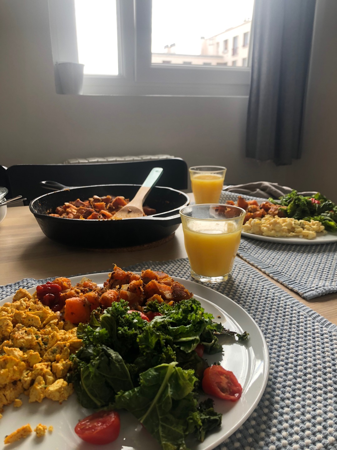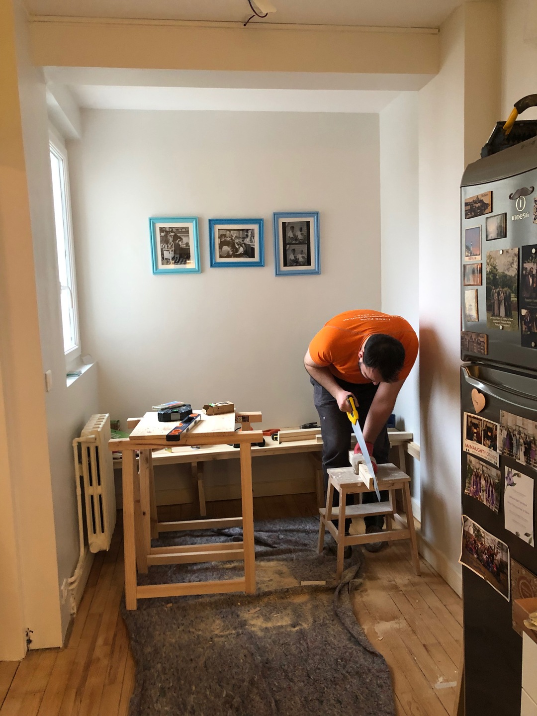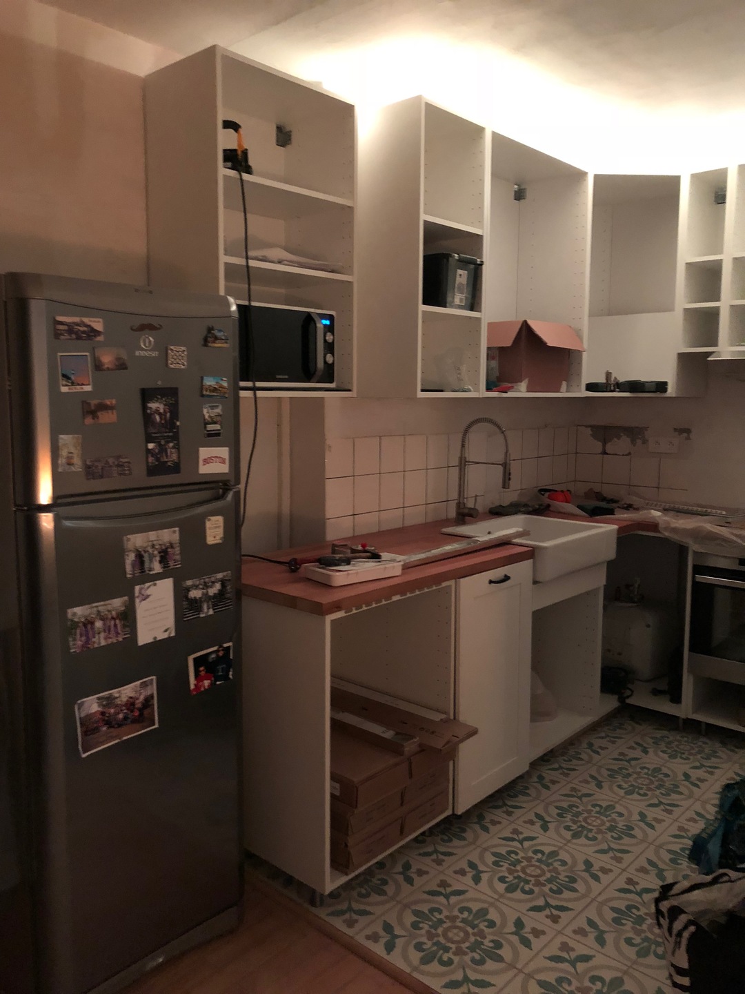The kitchen definitely needed a lot of work before we could actually use it. We had to completely gut the space. And of course by we I mean my husband did most of this work 😉 We also removed a wall so that we could extend the area. Next, we tiled the floor, which my dad helped us with. We cut the countertop pieces and installed the cabinets and appliances. This took a while to have every element fit together and work around the existing plumbing. The plumbing was also quite difficult but eventually we got things running. I painted the walls and lastly, we put in the tile backsplash. It was a lot of fun (and often frustrating) work spread out over a few months, but looking back we’re so glad we did it ourselves and are satisfied with this space.