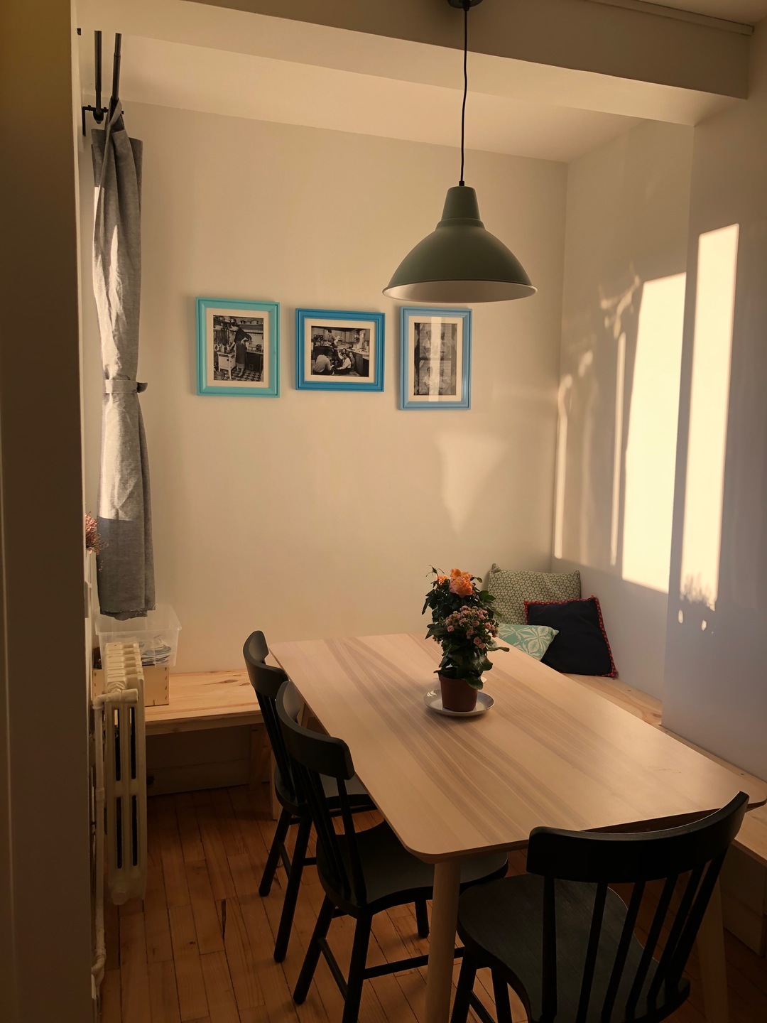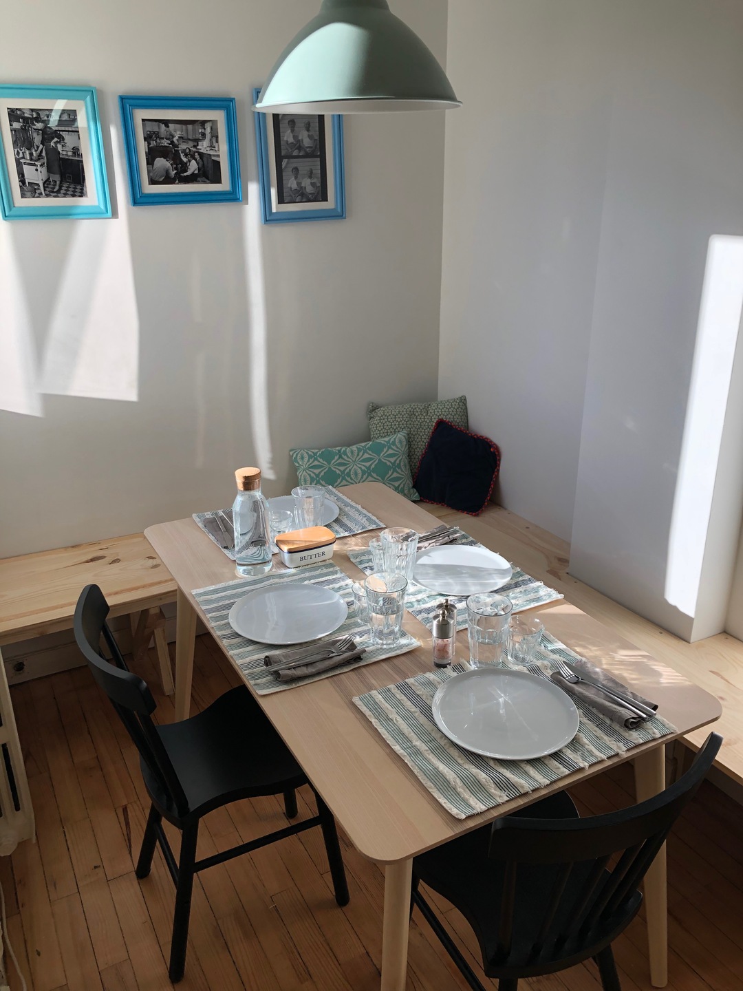 Off of our kitchen we have a dining area that gets really beautiful light in the mornings. We built an L shaped bench so that there’s the possibility of having lots of seating if needed. Eventually I plan to get around to painting that bench and making some cushions and adding lots of pillows. But for now it works well as is. (And of course I have some pictures of Julia Child hung up there!)